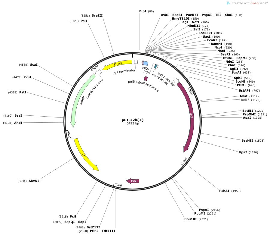 备注:pET22b载体含有PelB信号肽序列, 能够将表达的目的蛋白定位在细胞外周质腔。