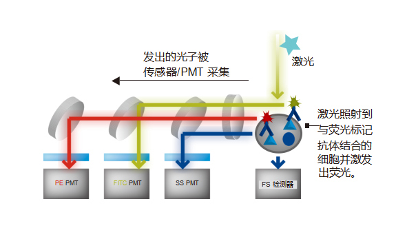 用于对靶蛋白进行检测 / 染色的荧光染料被相应激发波长的激光激发时将发出光线。那些被荧光标记了的颗粒或细胞,可以个别检 测和分析。