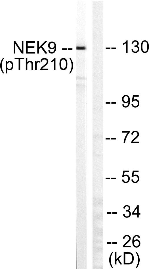 Specificity:Phospho-Nek9 (T210) Polyclonal Antibody detects endogenous levels of Nek9 protein only when phosphorylated at T210.
