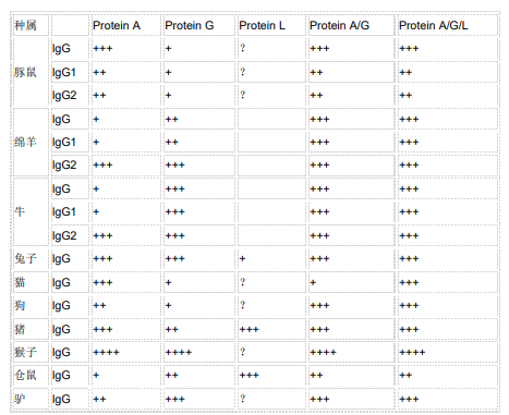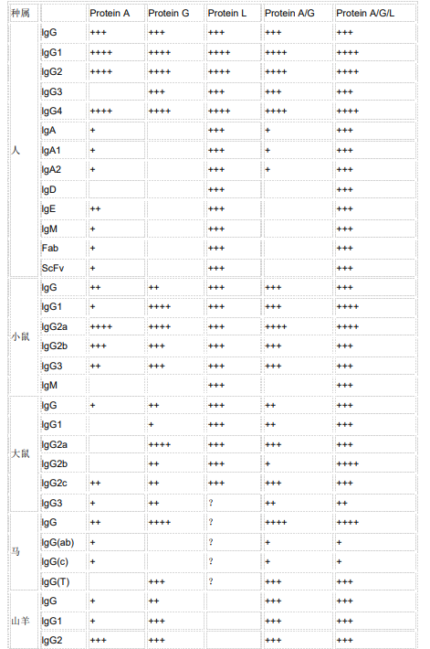 附录1. 蛋白A、G和L对不同物种Ig的结合能力总表