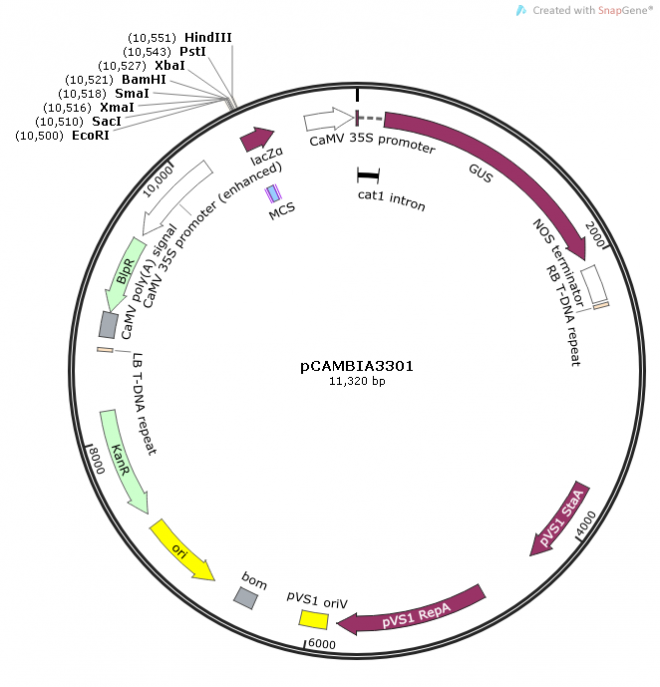 Basic product information:产品简介:植物双元表达载体,用于感染植物细胞,研究外源基因在植物组织细胞中的作用。载体含有报告基因gusA。产品参数:质粒类型:植物双元表达载体出品公司:Cambia高拷贝/低拷贝:高拷贝启动子:CAMV35S克隆方法:多克隆位点,限制性内切酶载体大小:11319 bp载体标签:C-GusA载体抗性:Kanamycin (卡那霉素)Other technical informationFor more information, please download and refer to the product manual。
