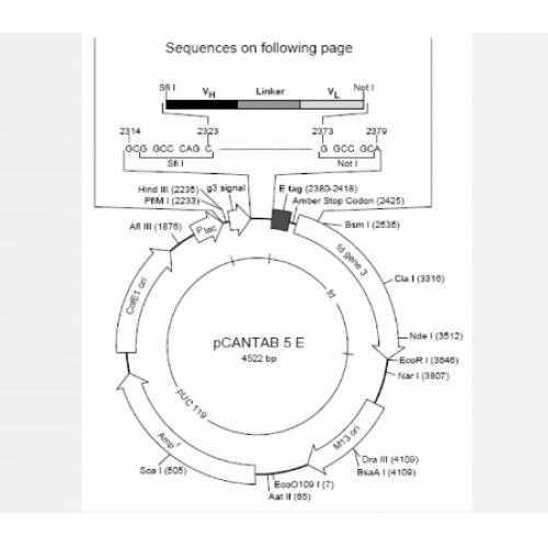 本载体在SfiI和NotI之间连入了ScFv,为pCANTAB 5E的酶切位点,客户可使用SfiI和NotI酶将连入的片段切掉,然后连入客户需要克隆的片段即可。