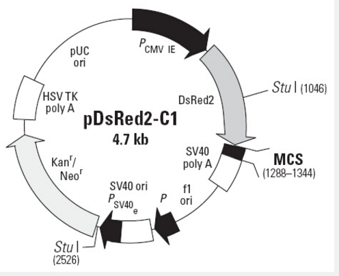 The multiple cloning site (MCS) in pDsRed2-C1 is positioned between the DsRed2 coding sequence and the SV40 polyadenylation signal (SV40 poly A). Genes cloned into the MCS will be expressed as fusions to the C-terminus of DsRed2 if they are in the same reading frame as DsRed2 and there are no intervening stop codons. A Kozak consensus translation initiation site upstream of DsRed2 increases the translation efficiency in eukaryotic cells (4). SV40 poly A signals downstream of the MCS direct proper processing of the 3' end of mRNA transcripts. The vector backbone also contains an SV40 origin for replication in mammalian cells expressing the SV40 T-antigen, a pUC origin of replication for propagation in E. coli, and an f1 origin for single-stranded DNA production. A neomycin resistance cassette (Neor ), consisting of the SV40 early promoter, the neomycin/kanamycin resistance gene of Tn5, and polyadenylation signals from the Herpes simplex virus thymidine kinase (HSV TK) gene, allows stably transfected eukaryotic cells to be selected using G418. A bacterial promoter upstream of this cassette expresses kanamycin resistance in E. coli.