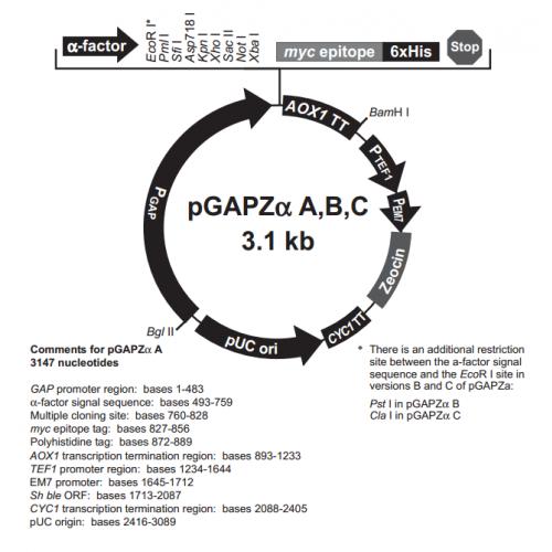 甘油醛-3-磷酸脱氢酶(GAPDH)的酶在许多生物细胞中包括毕赤酵母,稳定高水平表达。 最近,GAPDH蛋白编码基因启动子(GAP)被深入研究,并在毕赤酵母中能够高水表达重组蛋白,这取决于使用的碳源(Waterham等 人,1997)。GAP启动子(PGAP)的重组蛋白表达水平略高于AOX1启动子。 pGAPZ A,B,和C载体(2.9 KB)和pGAPZα,B,和C(3.1 KB)载体使用GAP启动子在毕赤酵母中稳定表达重组蛋白。重组蛋白表达为为带有C-末端myc抗原表位和C端His标签的融合蛋白。此外,pGAPZα 表达的融合蛋白在N-端带有酿酒酵母(Saccharomyces cerevisiae)的α-因子分泌信号肽。这两个系列的载体都提供三个不同读码框的载体,以方便克隆的带有C-端标签和/或N-末端分泌信号肽的载体 中。 这些载体是基于显性选择标记,Zeocin(博莱霉素)的筛选标记可以同时使用于毕赤酵母和大肠杆菌。