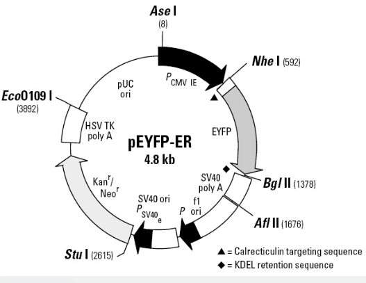 The pEYFP-ER vector encodes a fusion protein consisting of EYFP, the ER (where ER is endoplasmic reticulum) targeting sequence of calreticulin, and the ER retrieval sequence.