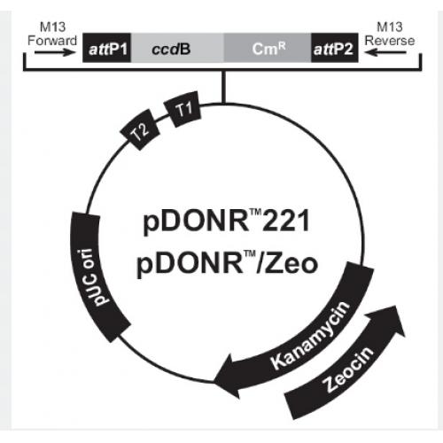 备注: 载体本身含有CCDb致死基因,能够使得普通的DH5alpha等细菌死亡,必须 使用DB3.1感受态细胞进行质粒扩增,用来构建Gateway系统入门载体.