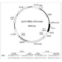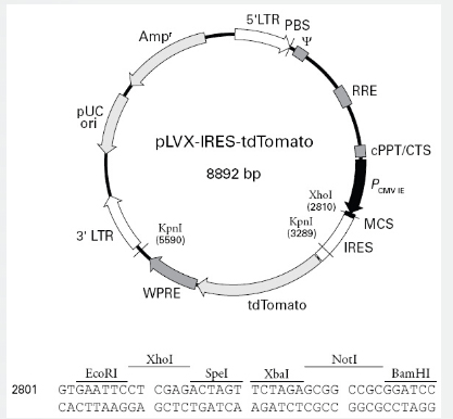 pLVX-IRES-tdTomato is an HIV-1-based, lentiviral expression vector that allows the simultaneous expression of your protein of interest and tdTomato in virtually any mammalian cell type, including primary cells. tdTomato is a member of the family of fruit fluorescent proteins derived from the Discosoma sp. red fluorescent protein, DsRed . The vector expresses the two proteins from a bicistronic mRNA transcript, allowing tdTomato to be used as an indicator of transduction efficiency and a marker for selection by flow cytometry.Expression of the bicistronic transcript is driven by the constitutively active human cytomegalovirus immediate early promoter (PCMV IE) located just upstream of the MCS. An encephalomyocarditis virus (EMCV) internal ribosome entry site (IRES), positioned between the MCS and tdTomato, facilitates cap-independent translation of tdTomato from an internal start site at the IRES/tdTomato junction .