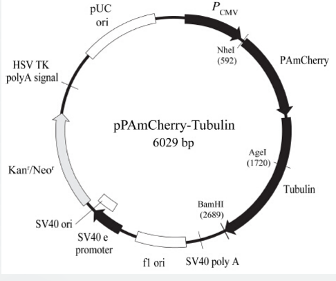 pPAmCherry-Tubulin Vector is a mammalian expression vector encoding PAmCherry, a photoactivatable mutant of the fluorescent protein mCherry, fused to human alpha-tubulin. PAmCherry is non-fluorescence until photoactivated by a short exposure to light at a wavelength between 350 nm and 400 nm. The excitation/emission wavelengths of photoactivated PAmCherry are 564 nm and 595 nm.