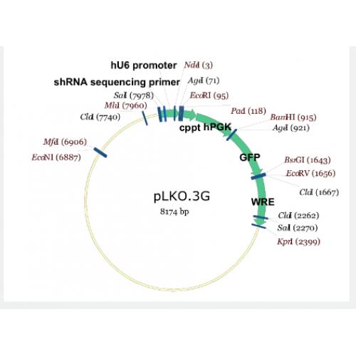 产品参数: 载体名称:pLKO.3G 出品公司:Addgene 质粒类型:慢病毒系统载体;RNAi 高拷贝/低拷贝:高拷贝 启动子:U6 克隆方法:多克隆位点,限制性内切酶 载体大小:8174bp 5' 测序引物及序列:GACTATCATATGCTTACCGT 3' 测序引物及序列:-- 载体标签:-- 载体抗性:Ampicillian 筛选标记:eGFP 备注:克隆菌株Stbl3 稳定性:-- 组成型:-- 病毒/非病毒:慢病毒