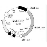 Expression of the IκB-EGFP is driven by the human CMV immediate-early promoter. The SV40 poly-A sequence directs proper processing of the 3' end of the fusion construct.The vector backbone also contains an SV40 origin for replication in mammalian cells expressing the SV40 T-antigen.A neomycin resistance cassette (Neor) allows kanamycin selection in E. coli and neomycin (G418) selection in eukaryotic cells.This cassette consists of the SV40 early promoter, the neomycin/kanamycin resistance gene of Tn5, and poly-A signalsthe Herpes simplex virus thymidine kinase (HSVTK) gene.The vector backbone also provides a pUC origin of replication for propagation in E. coli and an f1 origin for single-stranded DNA production.