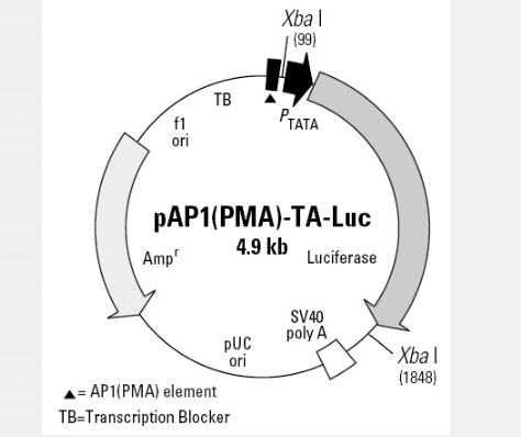 pAP1(PMA)-TA-Luc is a member of the signal transduction reporter vectors. It is designed for monitoring the induction of the protein kinase C (PKC) signal transduction pathway, as well as related pathways such as the MAPK pathway. pAP1(PMA)-TA-Luc contains the firefly luciferase gene (luc) as the reporter. The vector contains multiple copies of the activator protein 1 (AP1) enhancer, located upstream of luc, that responds specifically to phorbol ester treatment (1). AP1(PMA) is fused to a minimal TA promoter, the TATA box from the Herpes simplex virus thymidine kinase (HSV-TK) promoter. The luciferase coding sequence is followed by the SV40 late polyadenylation signal to ensure proper, efficient processing of the luciferase transcript in eukaryotic cells. A synthetic transcription blocker (TB) is located upstream of AP1(PMA), which is composed of adjacent polyadenylation and transcription pause sites for blocking nonspecific transcription (2). The vector backbone also contains an f1 origin for single-stranded DNA production, a pUC origin of replication, and an ampicillin resistance gene for propagation and selection in E. coli.