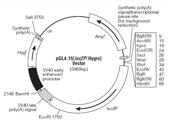 pGL4.15[luc2P/Hygro] 载体 质粒类型: 启动子报告载体 载体大小: 5969 bp (查看载体序列) 载体抗性: Ampicillin (氨苄青霉素) 筛选标记: Hygromycin 报告基因: Luc