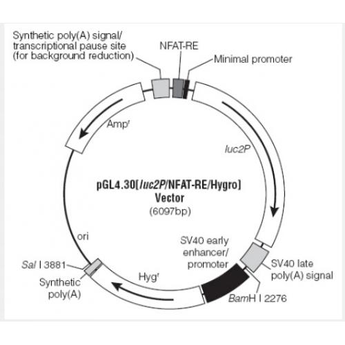 The pGL4.30[luc2P/NFAT-RE/Hygro] Vector(a–f) contains an NFAT response element (NFAT-RE) that drives the transcription of the luciferase reporter gene luc2P (Photinus pyralis). luc2P is a synthetically-derived luciferase sequence with humanized codon optimization that is designed for high expression and reduced anomalous transcription. The luc2P gene contains hPEST, a protein destabilization sequence. The protein encoded by luc2P responds more quickly than the protein encoded by the luc2 gene upon induction. The vector backbone contains an ampicillin resistance gene to allow selection in E. coli and a mammalian selectable marker for hygromycin resistance.