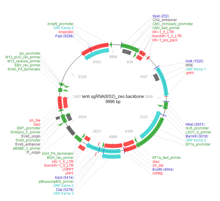 基本信息: 质粒类型:慢病毒表达载体,CRISPR/Cas系统 启动子:EF1a 出品公司:Addgene 载体大小:9996 bp (查看载体序列) 载体抗性:Ampicillin 筛选标记:Zeocin